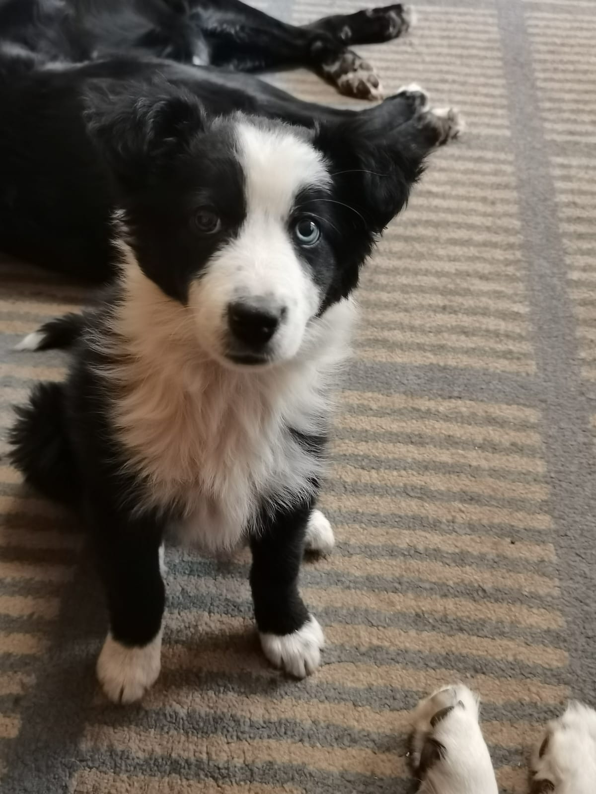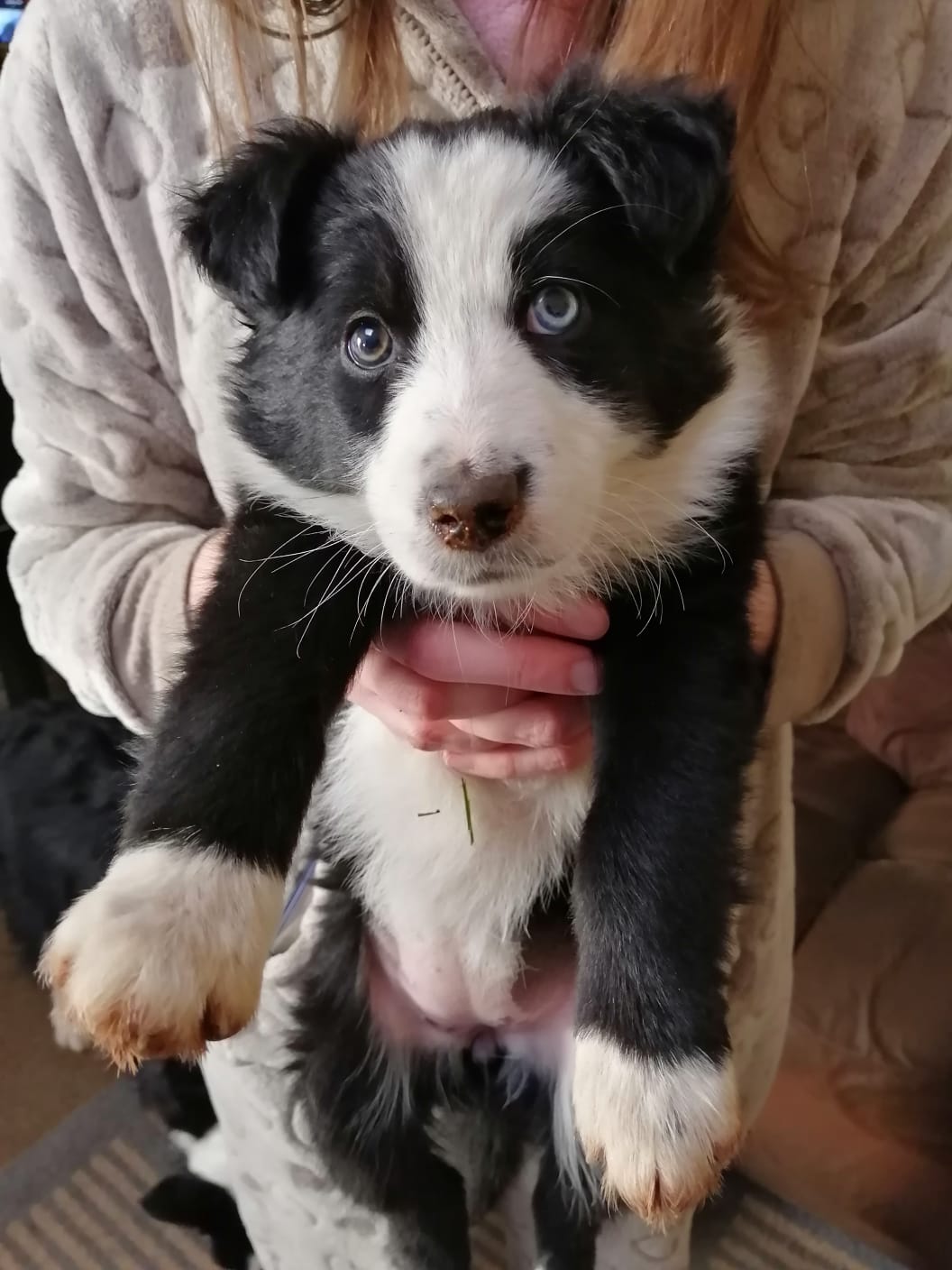 My name’s Ziggy and I was born on the 1st July 2021. I am a black and white border collie with one blue eye and one brown eye. I joined my new family on 22nd August 2021. I am currently 8 weeks old and my weight 2.5 kg. I was very shy coming into my new family, I didn’t know what they would be like or what my new siblings would be like. Now after a few days I have found that grass is my favourite and Scrappy is fun to play with, she looks after me. I’m still working on Shaggy but he let’s me lie down next to him (hopefully he’ll let me cuddle with him soon) so that’s all good even if he doesn’t want to play with me, hopefully he will soon and then I can run around the garden and have fun with them. Wish me luck!
